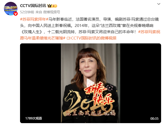 马年新春临近,法国著名演员、导演、编剧苏菲·玛索通过总台镜头,向中国人民送上新春祝福。2014年,这朵“法兰西玫瑰”曾在央视春晚唱响《玫瑰人生》,十二载光阴流转,苏菲·玛索又将迎来自己的本命年!